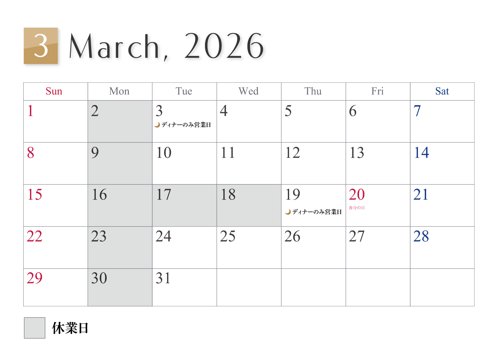 2026年 3月 営業日のご案内