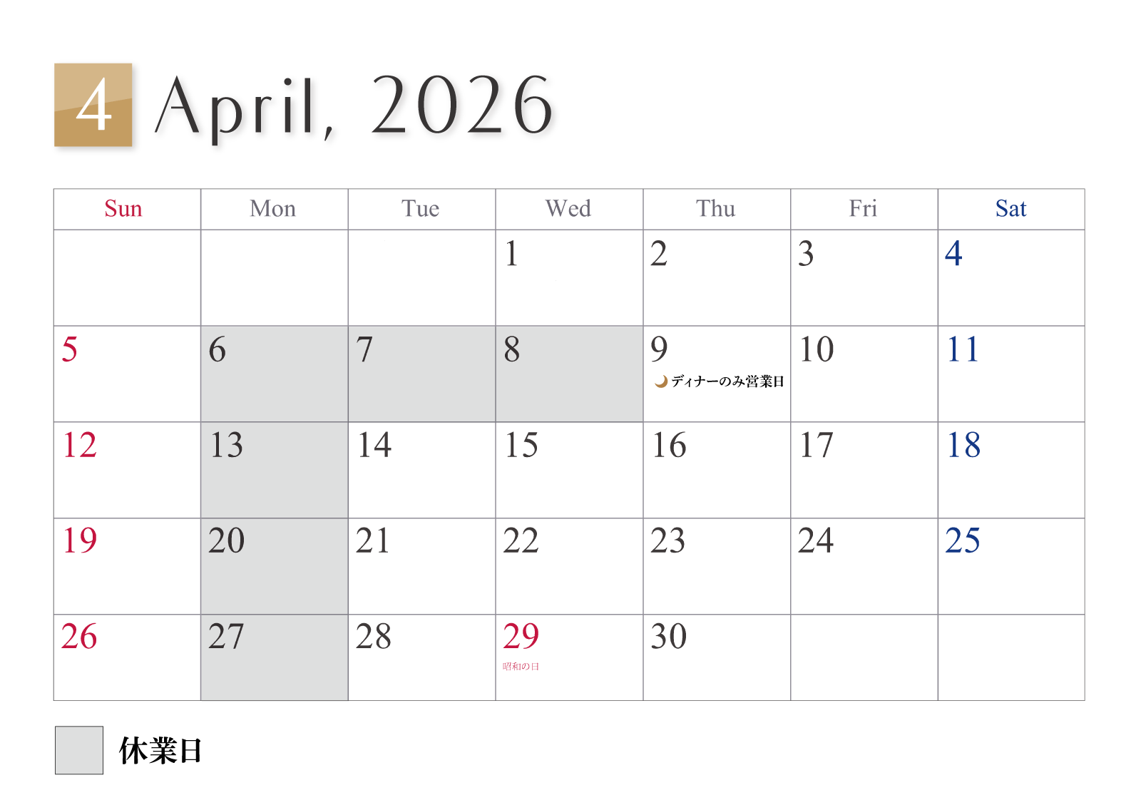 2026年 4月 営業日のご案内